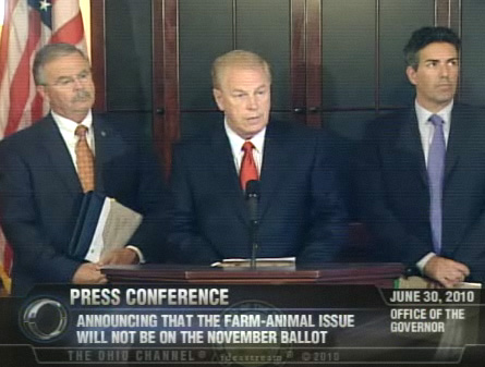 In exchange, OFB Vice-president Tony Fisher, agriculture leaders, and Governor Strickland agreed to push the following reforms for farmed animals: