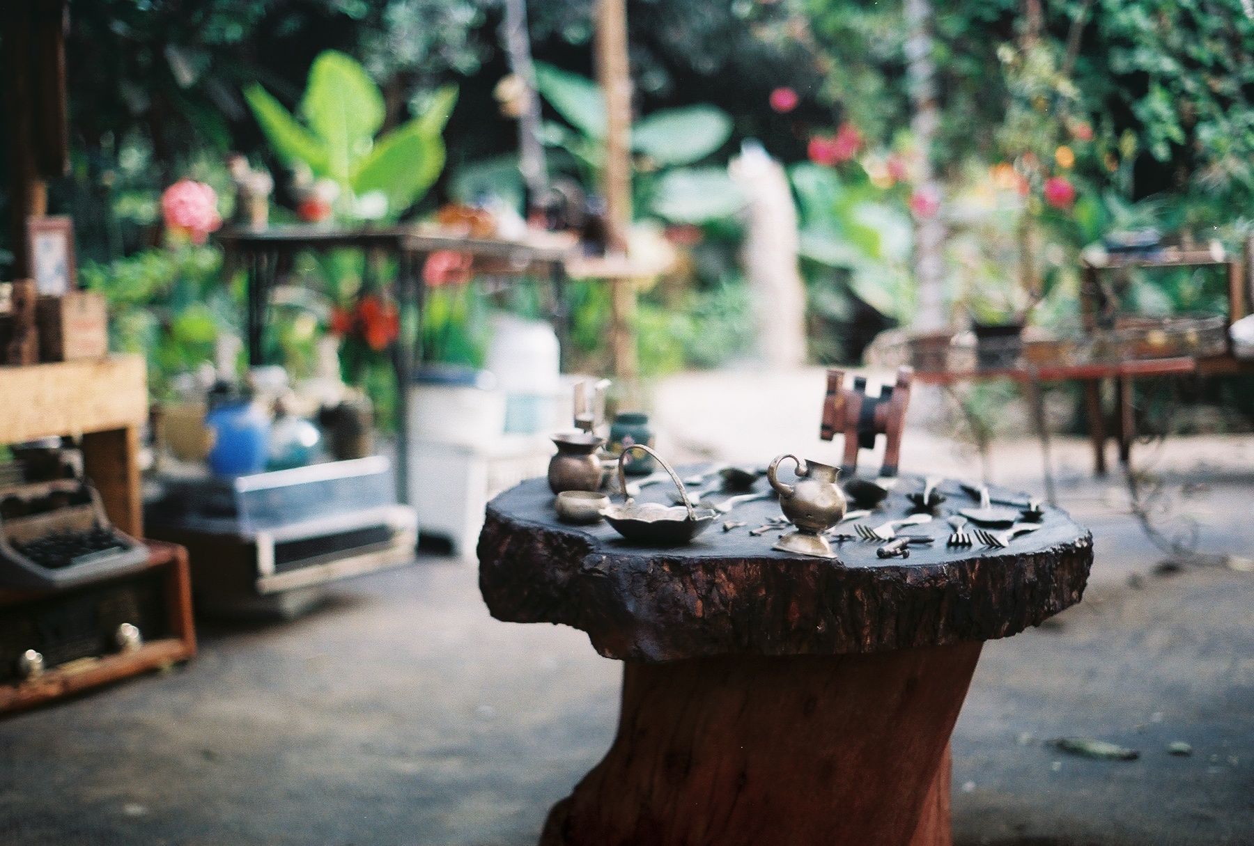 While birds linger over flowers, compositions of antique curios detain humans visitors.