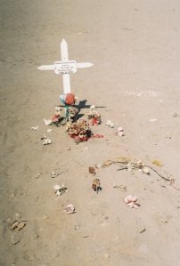 One of the simplest graves in the San Miguel de Azapa's Aymara cemetery, strewn with plastic flowers.