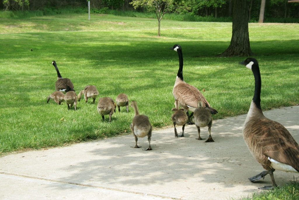 A gaggle of Canada geese crosses a path in Cincinnati's Sharon Woods. Photo courtesy of Konstantin Vasserman.