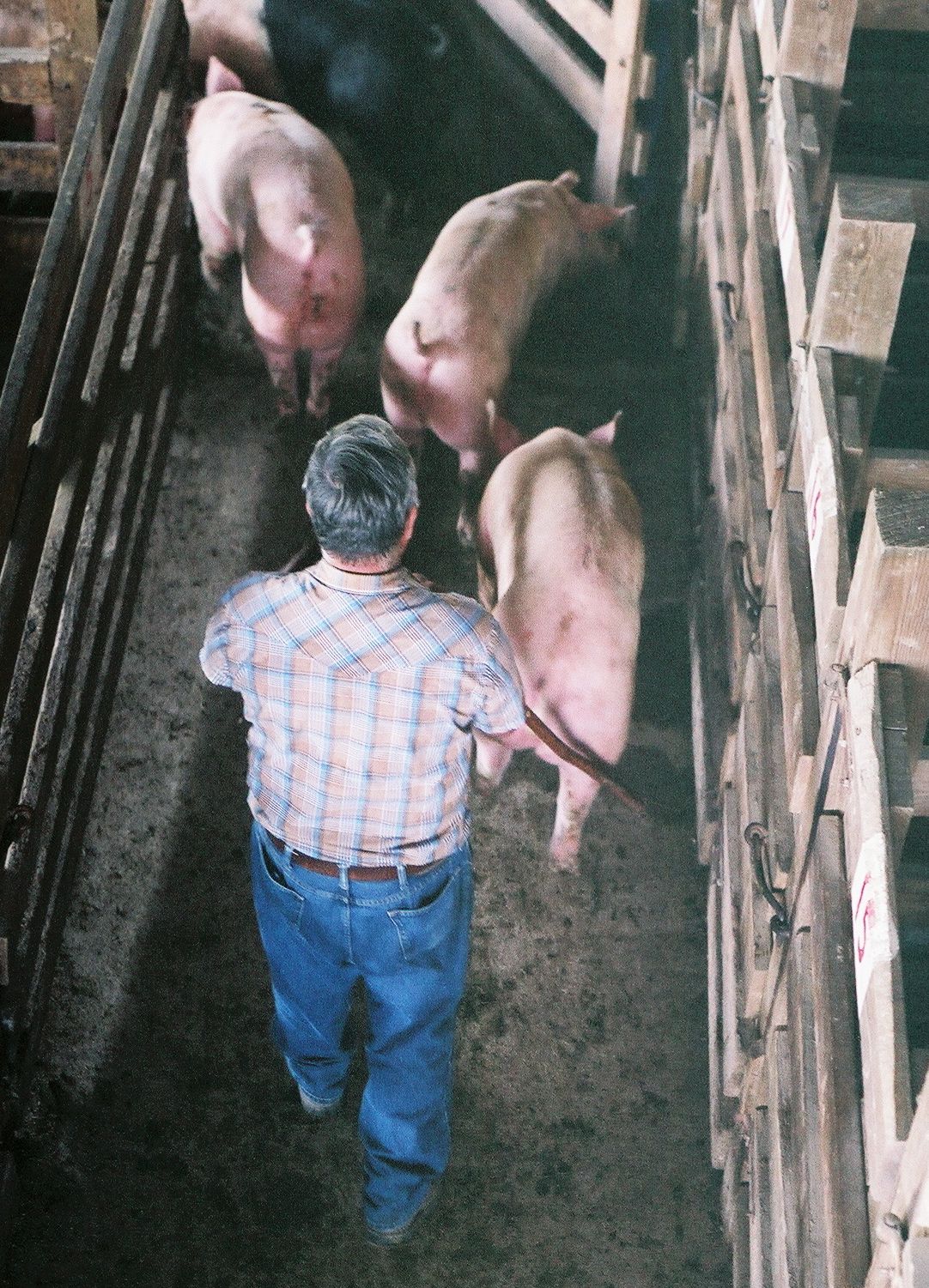 A White's Livestock Auction employee moves pigs into a waiting pen, in Brookville, IN.
